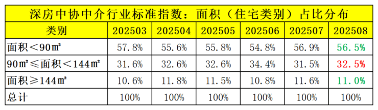 面积分布:8月二手住宅类别中,录得面积大于等于90平方米小于144的房源占比较上月提升1.0个百分点。(注:表中红色字体代表较上月上升,绿色代表下降)