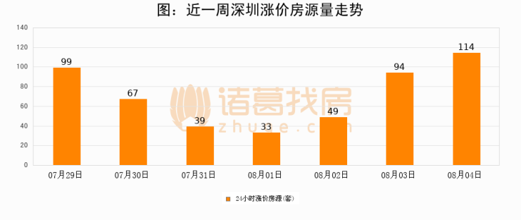 根据诸葛找房数据显示,深圳24小时涨价房源量为114套,较08月03日增加20套,环比上涨21.3%。与此同时,涨价房源占比小幅扩大,业主信心有所提升。