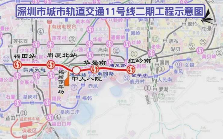 11号线二期工程起于岗厦北站(不含),主要沿深南大道—福华路—南园路—埔尾路—金华街敷设,止于红岭南站。线路全长约4.39公里,共设3座车站,另含11号线机场北停车场改扩建工程。深圳地铁11号线二期工程在红岭南站与9号线换乘,华强南站与7号线换乘,岗厦北站(不含)与2/8号线、10号线、14号线换乘。