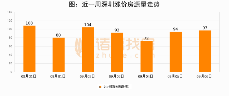 根据诸葛找房数据显示,深圳24小时涨价房源量为97套,较09月05日增加3套,环比上涨3.2%。与此同时,涨价房源占比小幅扩大,业主信心有所提升。