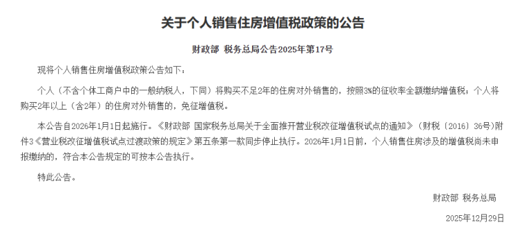 个人(不含个体工商户中的一般纳税人,下同)将购买不足2年的住房对外销售的,按照3%的征收率全额缴纳增值税;个人将购买2年以上(含2年)的住房对外销售的,免征增值税。本公告自2026年1月1日起施行。《财政部国…
