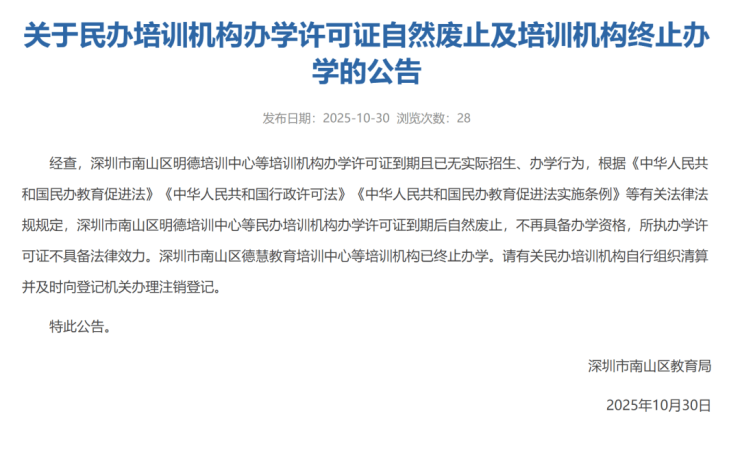 南山区教育局表示,根据《中华人民共和国民办教育促进法》《中华人民共和国行政许可法》《中华人民共和国民办教育促进法实施条例》等有关法律法规规定,部分民办培训机构办学许可证到期后自然废止,不再具备办学资格,所执办学许可证不具备法律效力。深圳市南山区德慧教育培训中心等培训机构已终止办学。请有关民办培训机构自行组织清算并及时向登记机关办理注销登记。