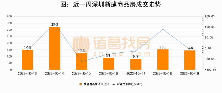 根据深圳市住房和城乡建设局数据显示,2023年10月19日深圳新建商品房成交144套,较昨日减少7套,环比下降4.6%