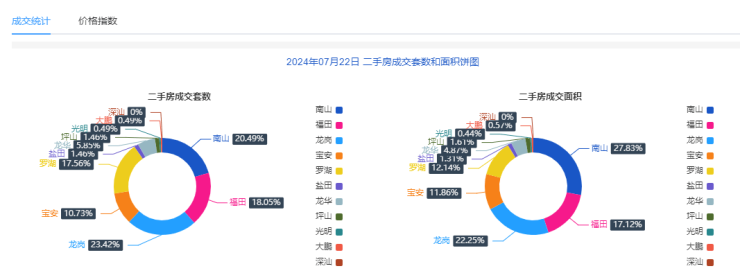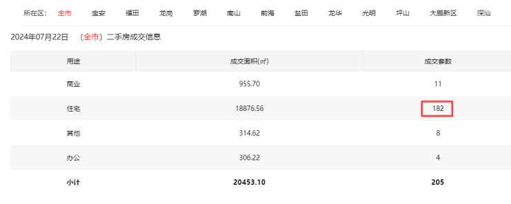 2024年7月22日二手房住宅网签182套。宝安22套;福田34套;龙岗45套;罗湖30套;南山36套;盐田3套;龙华7套;光明1套;坪山3套;大鹏1套。