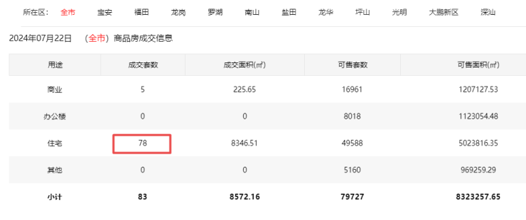 2024年7月22日新房住宅共网签78套。宝安24套;福田1套;龙岗11套;罗湖2套;南山7套;盐田0套;龙华8套;坪山4套;光明21套;大鹏0套;深汕0套。