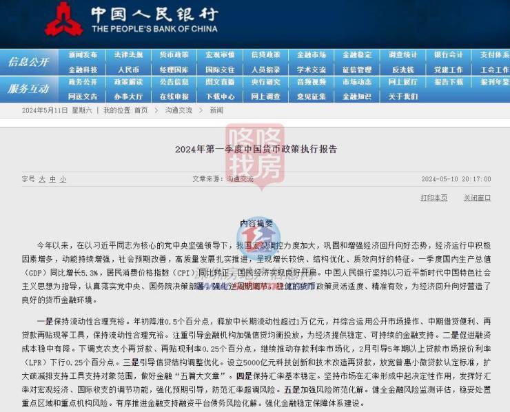 5月10日,央行发布2024年第一季度中国货币政策执行报告。