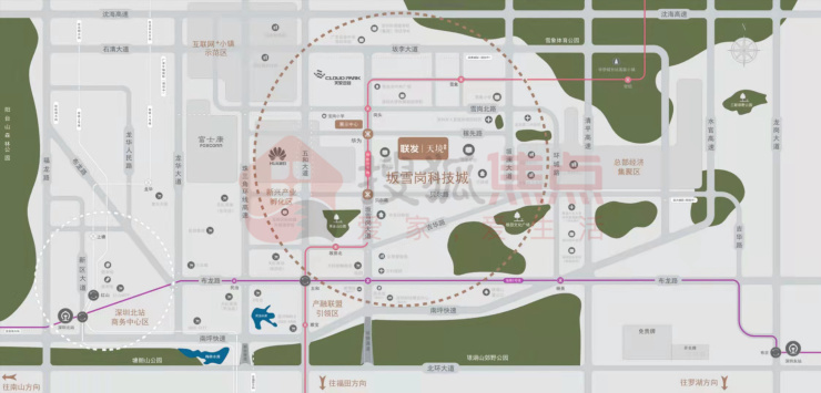 联发天境雅居位于坂田街道稼先路与坂澜大道交汇处西北侧,项目南面与西面紧邻万科城社区,东面是雪象学校,北面一路之隔则近雪象花园新村、云力智谷产业园。