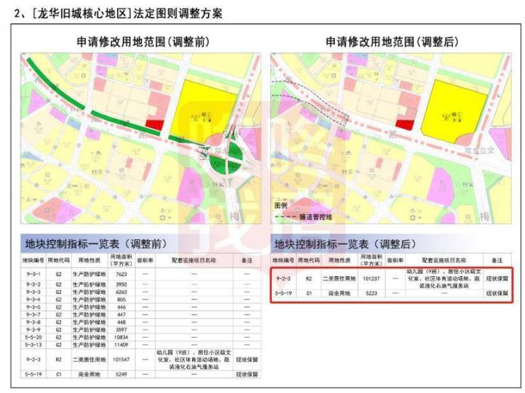 值得一提的是,龙华旧城核心地区由原来的多宗生产防护绿地调成为2宗地块,一宗为二类居住用地,一宗为商业用地。其中9-2-3调整后地二类居住用地达10万平。