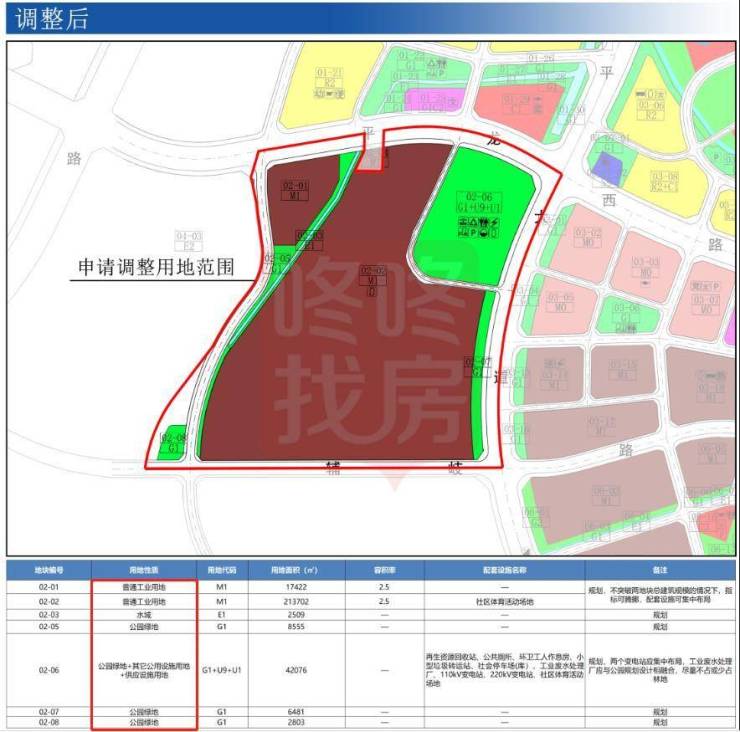 公示显示,地块02-01~02-34其中有二类居住用地、小学用地以及三类居住用地,调整成为工业用地以及公园用地。