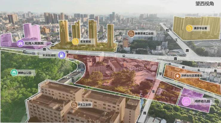 项目北侧临洪桥头社区居民委员会、城中村与鸿桥幼儿园(民办),东侧靠现状工业园(洪桥头学生工业园),西侧邻广深公路,南侧与现状平深加油站相邻。