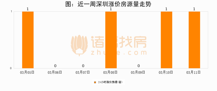 根据诸葛找房数据显示,深圳24小时涨价房源量为1套,较03月10日持平。