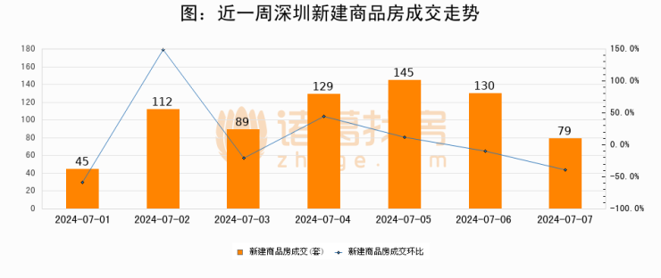 根据深圳市住房和城乡建设局数据显示,2024年07月07日深圳新建商品房成交79套,较昨日减少51套,环比下降39.2%。近一周深圳新建商品房日均成交105套。07月07日单日成交79套,低于近一周平均水平24.8%。