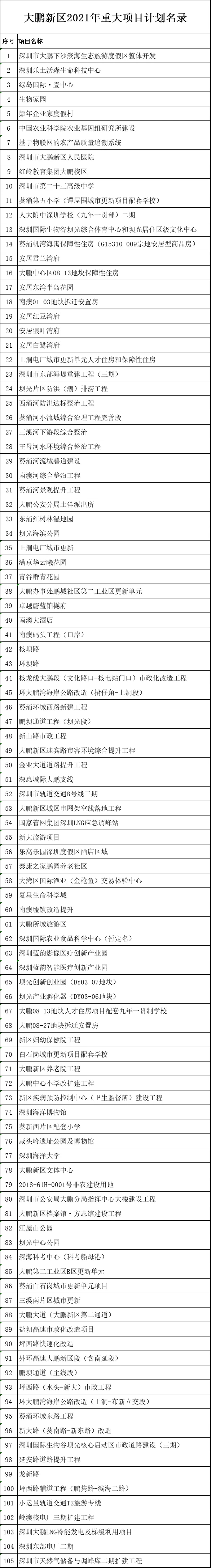 大鹏新区2021年重大项目计划名录