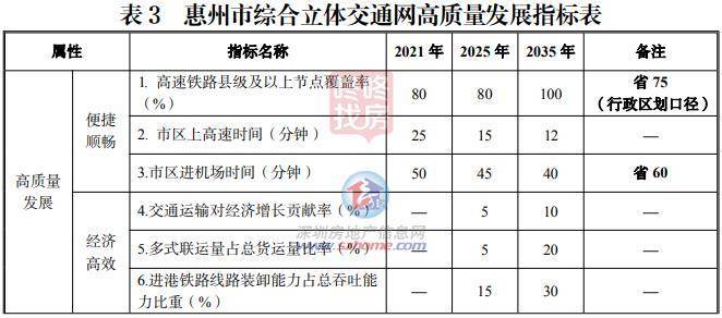 ——“1123”快货物流圈:市内当天送达,省内1天送达,国 内及东南亚城市2天送达,全球主要城市3天送达。 至本世纪中叶,新技术、新业态加快发展,综合立体交通网 向更高质量、更高效率、更高品质迈进,全面建成设施互联、运 行高效、管理协同、服务优质、人民满意、保障有力的现代化高质量综合立体交通网,建设成为大湾区内外联动的战略支点,全 面服务和保障惠州社会主义现代化强市迈入新征程。