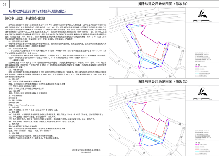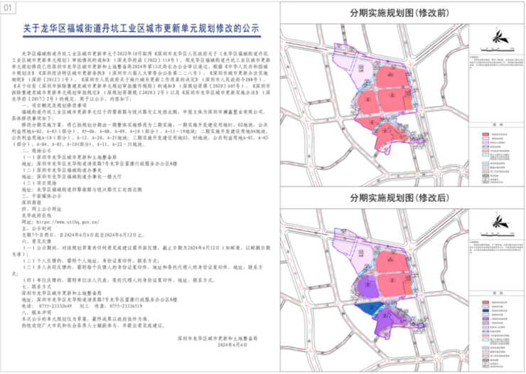 近日,深圳市龙华区城市更新和土地整备局发布关于龙华街道河背老村片区、福城街道丹坑工业区等两个城市更新单元规划修改对外公告。