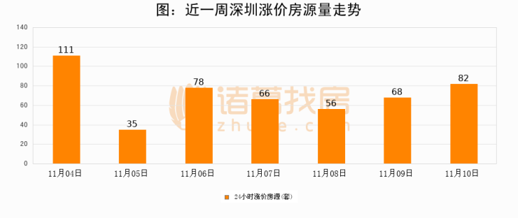 根据诸葛找房数据显示,深圳24小时涨价房源量为82套,较11月09日增加14套,环比上涨20.6%。与此同时,涨价房源占比小幅扩大,业主信心有所提升。