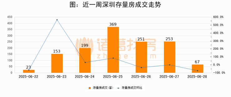 从存量房来看,2025年06月28日深圳存量房单日成交67套,比昨日减少186套,环比下降73.5%。从近一周存量房成交来看,深圳存量房日均成交套数为187套,06月28日单日成交67套,低于近一周平均水平64.2%。