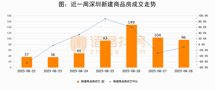 根据深圳市住房和城乡建设局数据显示,2025年06月28日深圳新建商品房成交96套,较昨日减少8套,环比下降7.7%。近一周深圳新建商品房日均成交81套。06月28日单日成交96套,高于近一周平均水平18.5%。