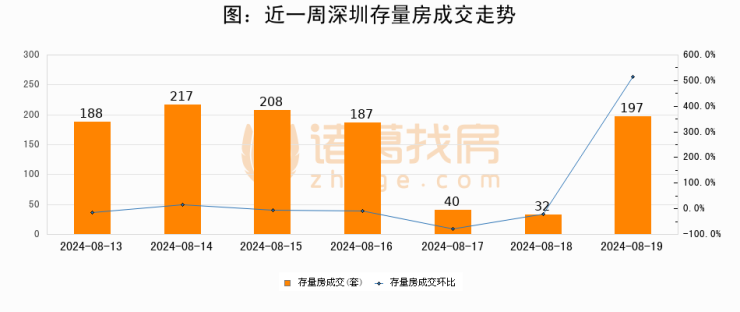 从存量房来看,2024年08月19日深圳存量房单日成交197套,比昨日增加165套,环比上涨515.6%。从近一周存量房成交来看,深圳存量房日均成交套数为152套,08月19日单日成交197套,高于近一周平均水平29.6%。