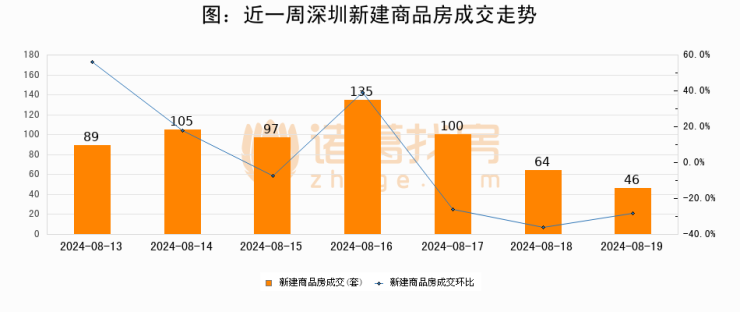根据深圳市住房和城乡建设局数据显示,2024年08月19日深圳新建商品房成交46套,较昨日减少18套,环比下降28.1%。近一周深圳新建商品房日均成交91套。08月19日单日成交46套,低于近一周平均水平49.5%。