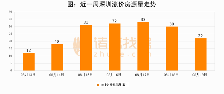 根据诸葛找房数据显示,深圳24小时涨价房源量为22套,较08月18日减少8套,环比下降26.7%。与此同时,涨价房源占比小幅回落,对于购房者来说是一个入市窗口期,购房者可抓住时机入市。