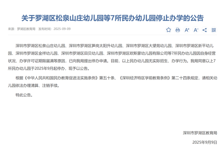 公告提到,因自身经营状况、办学许可证期限届满等原因,幼儿园已向罗湖区教育区提出停办申请。目前,以上民办幼儿园无实际招生、办学行为。以上7所民办幼儿园于2025年9月起停办。