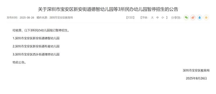 近日,宝安区教育局发布德智幼儿园等多所民办幼儿园暂停招生的公告。经核查,宝安区新安街道德智幼儿园、宝安区新安街道布星幼儿园、宝安区西乡街道理思幼儿园、宝安区新安街道安乐幼儿园、宝安区西乡街道海润幼儿园、宝安区石岩街道爱爱幼儿园6所民办幼儿园已暂停招生。