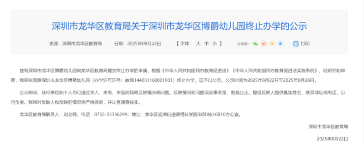 福田区竞智幼儿园也在近日发布停办公告,表示于8月25日正式停止办园运营。