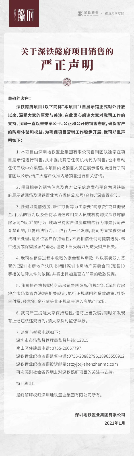 刚刚!销售团队公示,南山深铁懿府声明:无喝茶费!
