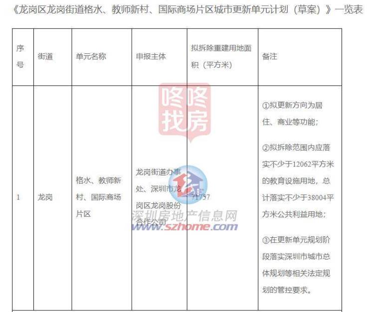 2月10日,龙岗发布了关于《龙岗区龙岗街道格水、教师新村、国际商场片区城市更新单元计划(草案)》的公示。