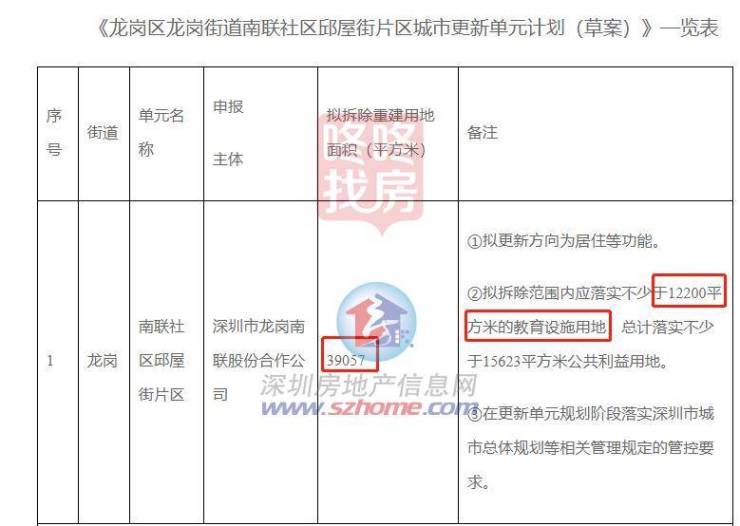 南联社区邱屋街片区,拟拆除重建用地面积39057平方米,拟更新方向为居住等功能。拟拆除范围内应落实不少于12200平方米的教育设施用地,总计落实不少于15623平方米公共利益用地。