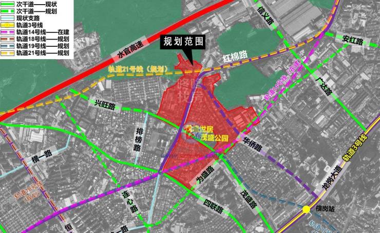 项目位于龙岗区横岗街道红棉路与茂盛路交汇处,距离轨道3号线横岗站约700米。