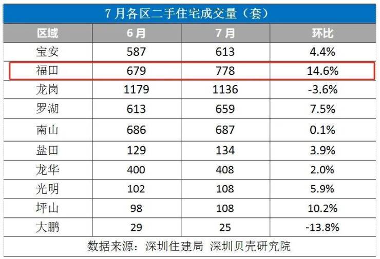 紧随其后的是福田、南山和罗湖三个核心片区,其中福田涨幅最为明显,环比上涨了16.6%,相当于比上个还多卖了约100套房。