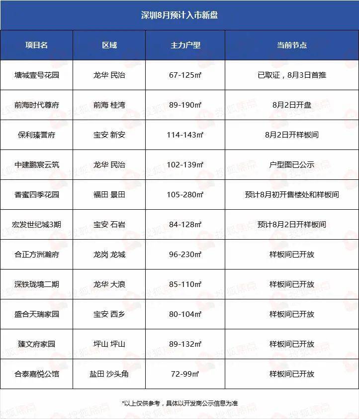 据@搜狐焦点深圳 不完全统计,8月预计有11个住宅新盘计划入市,在这份清单中,不乏热度高、位置优越的项目,如保利瑧誉府、中建鹏宸云筑、香蜜四季花园等项目。