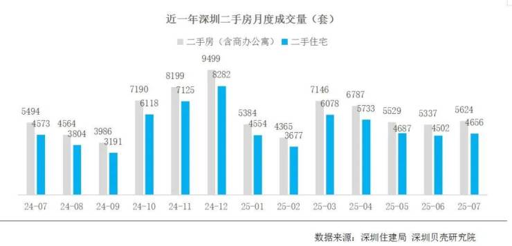 官方统计的网签量来看,7月深圳备案了5624套二手房,其中大家最为关注的二手住宅有4656套,环比微涨了3.4%。
