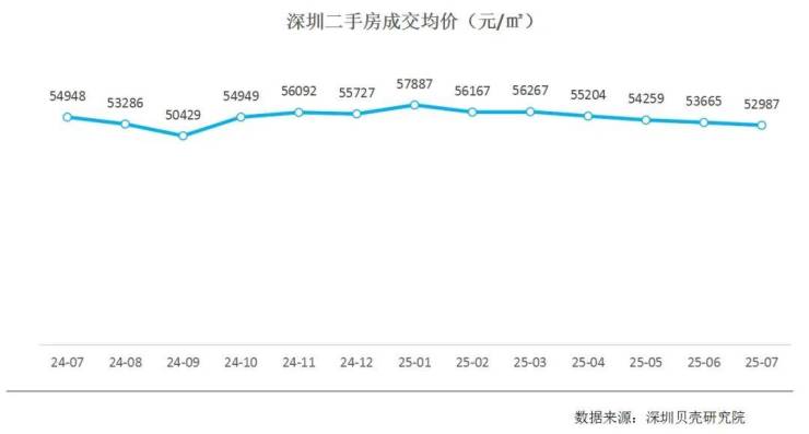 深圳贝壳研究院统计,7月深圳二手房成交均价环比6月微跌了1.3%,为52987元/㎡。