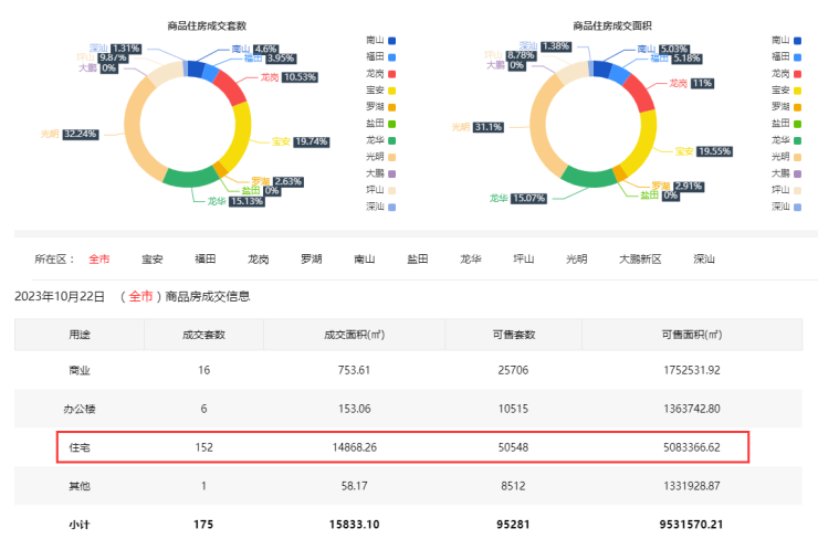 10月22日新房住宅共网签152套。宝安30套;福田6套;龙岗16套;罗湖4套;南山7套;盐田0套;龙华23套;坪山15套;光明49套;大鹏0套;深汕2套。