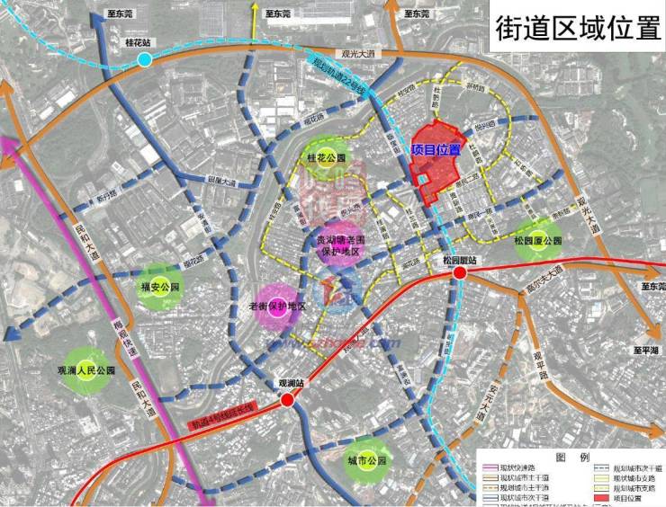 项目位于观澜街道桂花路与沿河东路交汇处东侧。更新单元用地面积73875.4平方米,拆除范围用地面积71209.4平方米,其中开发建设用地面积32274.5平方米。