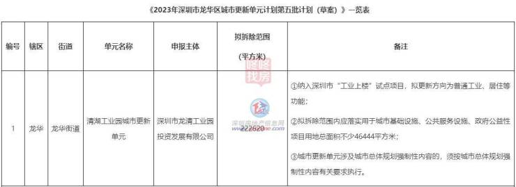 5月12日,清湖工业园城市更新单元被例入龙华区城市更新单元计划第五批计划,目前更新草案已发布,正在公示中。