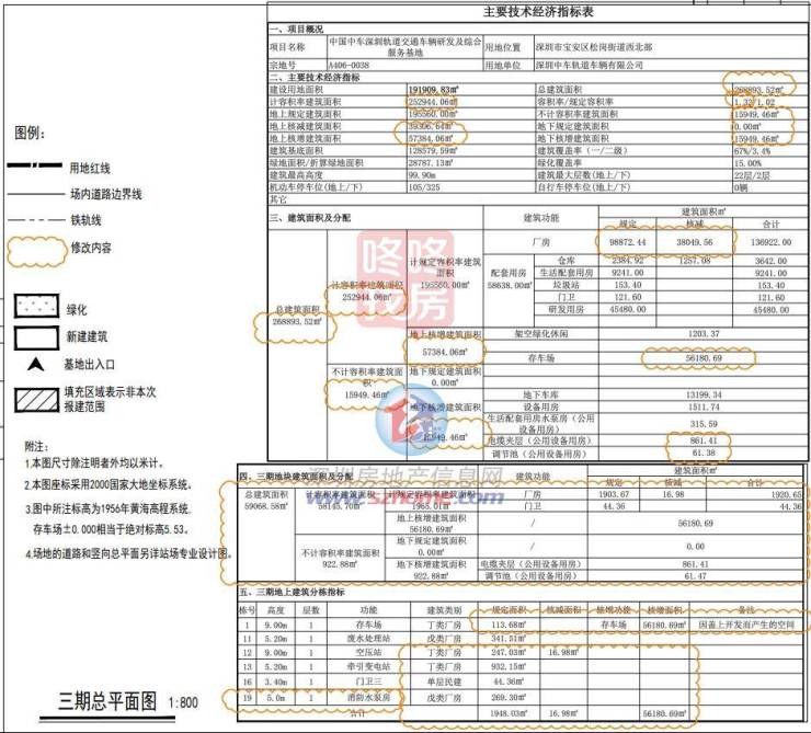 项目名中国中车深圳轨道交通车辆研发及综合服务基地,位于宝安松岗街道西北部,建筑面积191909.83平方米,计容积率建筑面积252944.06平方米,总建筑面积268893.52平方米,建筑最大层数地上22层,地下2层。其中包含停车场56180.69平方米。