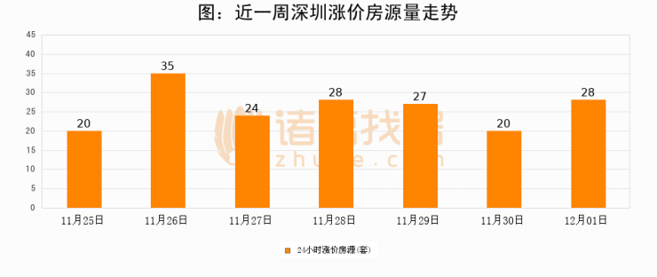 根据诸葛找房数据显示,深圳24小时涨价房源量为28套,较11月30日增加8套,环比上涨40%。与此同时,涨价房源占比小幅扩大,业主信心有所提升。