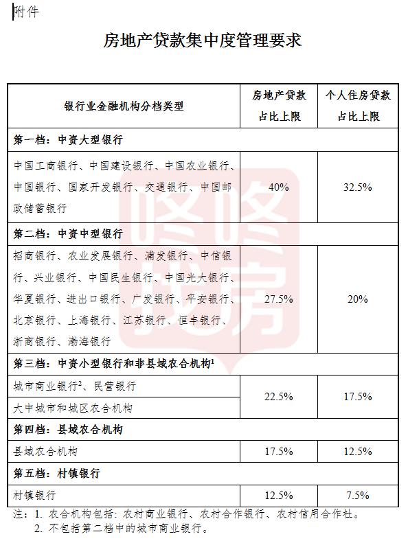 工商银行、建设银行、农业银行、中国银行、国家开发银行、交通银行、中国邮储银行:房地产贷款占比上限40%,个人住房贷款上限32.5%。