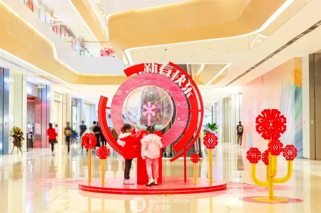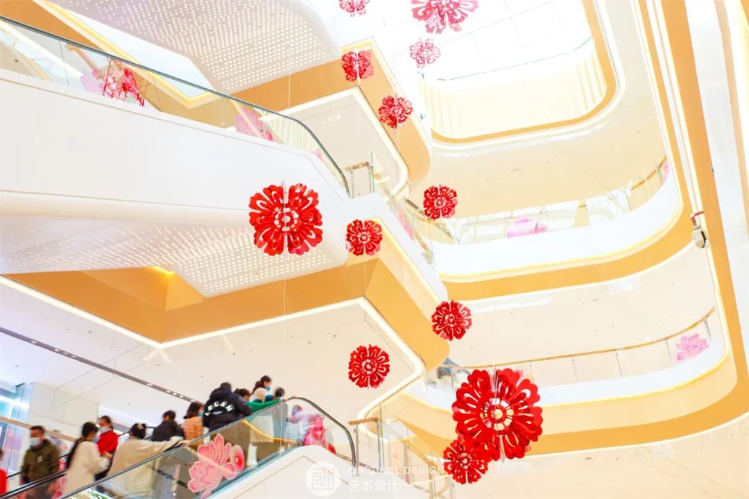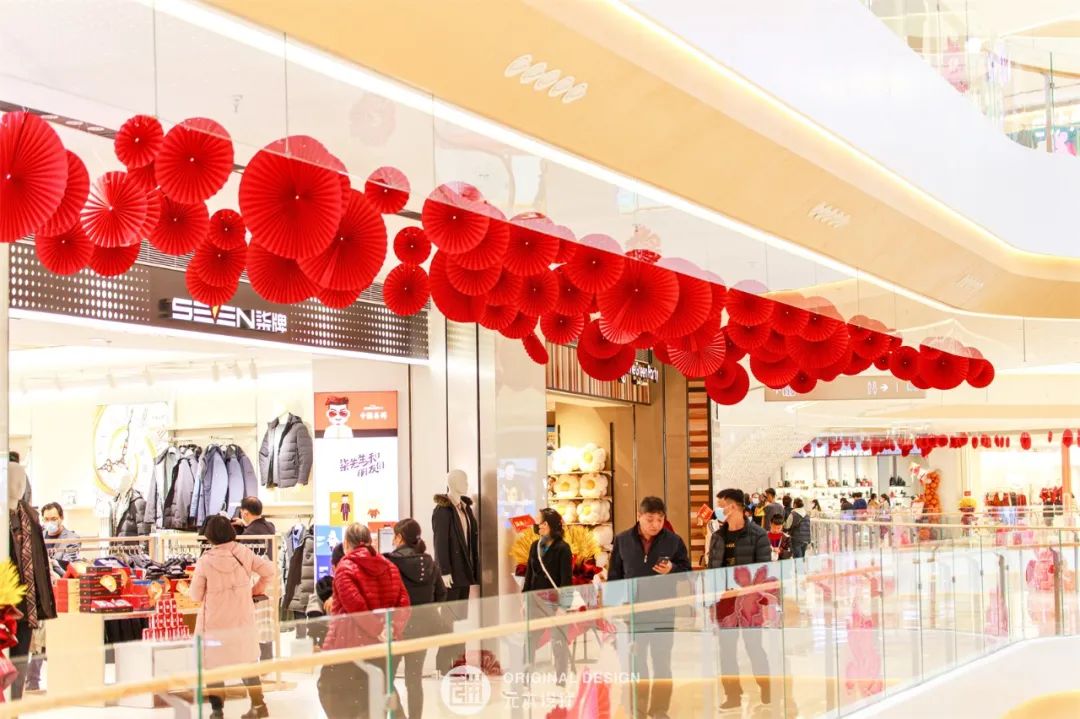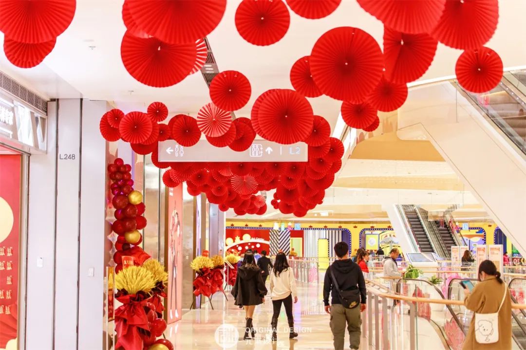 商场内,正红色的纸扇错落有致的别在廊道上,该场景式的打造在传递传统美韵的同时也对现场起到了亮化美观的作用,处处充满着新年的喜庆与欢乐。