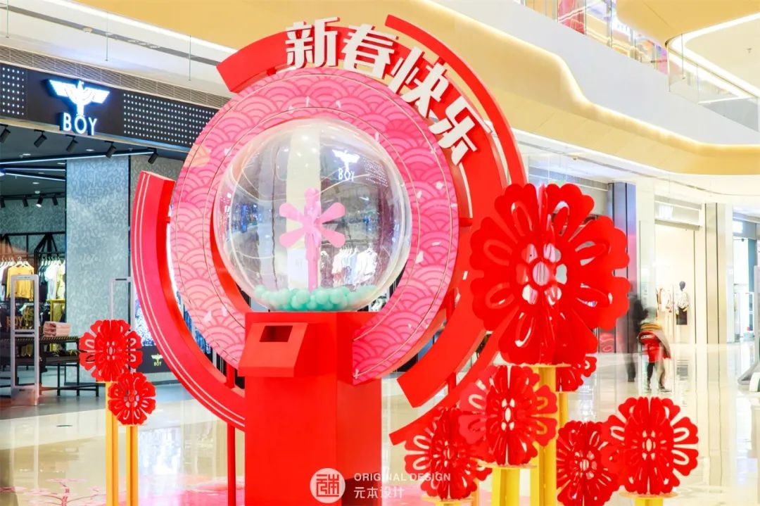 迎合春节的气氛,在中庭的美陈装置内置鼓风机,向里吹气,装置内的小球会随之晃动,随后可抽出一枚扭蛋。