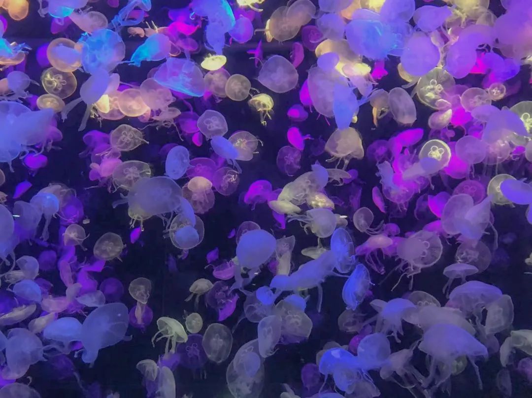 它们在水中形态多变,晶莹透亮,身体柔软如绸,长着无数个触角,悠然自得地游着,恍若虚幻。那些呈桃花形分布的触角状物体,又像天上的流星在闪烁,有些闪耀着微弱的淡绿色或蓝紫色光芒,有的还带有彩虹般的光晕。
