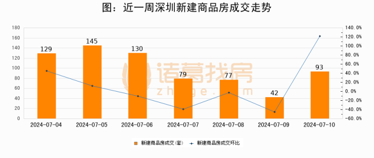 根据深圳市住房和城乡建设局数据显示,2024年07月10日深圳新建商品房成交93套,较昨日增加51套,环比上涨121.4%。近一周深圳新建商品房日均成交100套。07月10日单日成交93套,低于近一周平均水平7%。