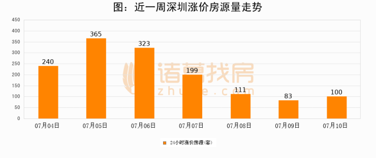 根据诸葛找房数据显示,深圳24小时涨价房源量为100套,较07月09日增加17套,环比上涨20.5%。与此同时,涨价房源占比小幅扩大,业主信心有所提升。