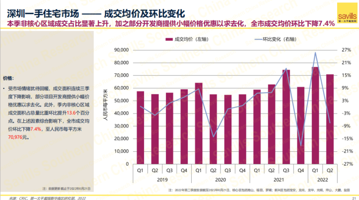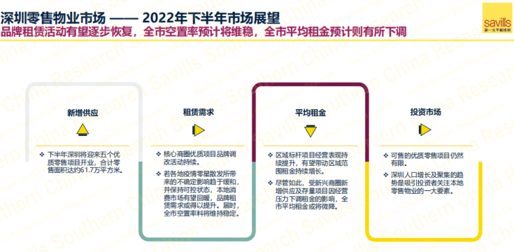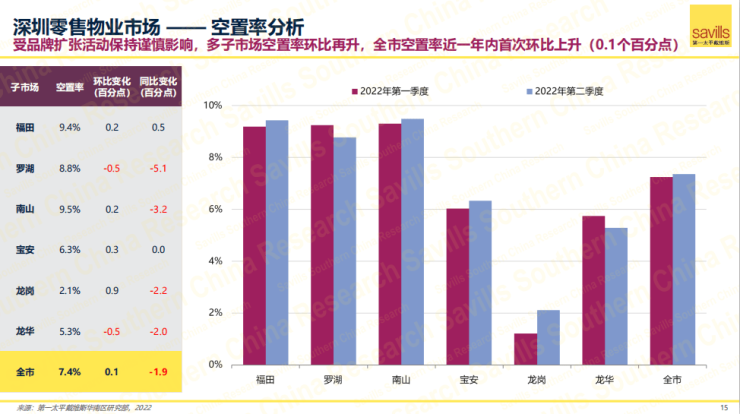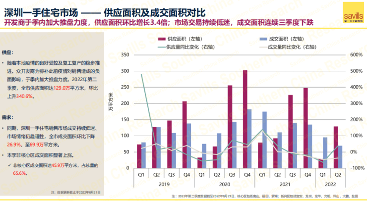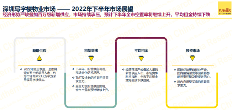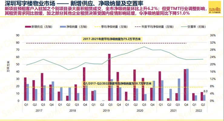 “第二季度,在疫情反复及经济增长承压的双重影响下,深圳房地产市场亦受一定冲击。写字楼市场需求倾软,租金录近两年较大降幅;零售品牌扩张谨慎,空置率近一年首次上升;住宅市场延续理性情绪,全市成交面积连续三季度下跌。“