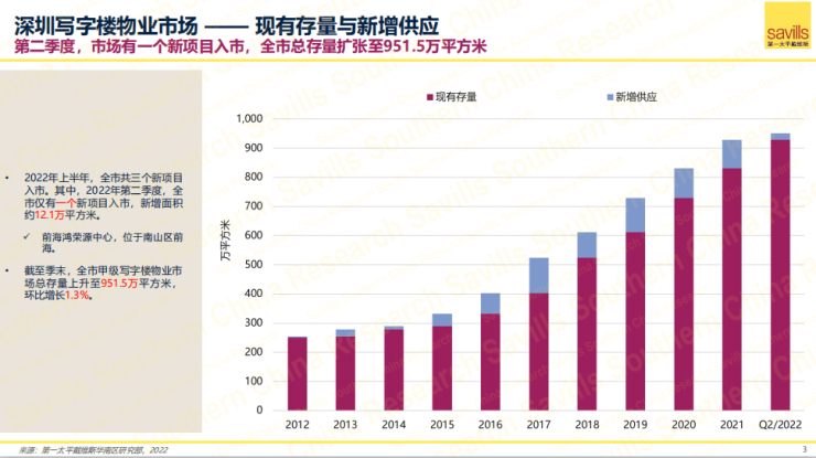 · 2022年第二季度,全市仅有一个项目交付入市,为市场带来12.1万平方米甲级写字楼面积。截至季末,全市总存量升至951.5万平方米,环比扩张1.3%。