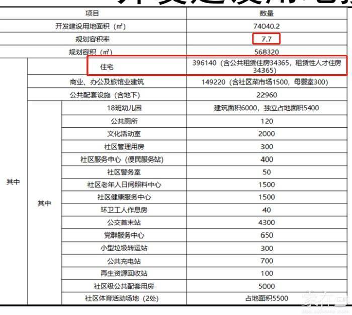 项目规划容积率7.7,其中,住宅396140平方米(含公共租赁住房34365平方米,租赁性人才住房34365平方米)。